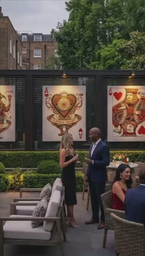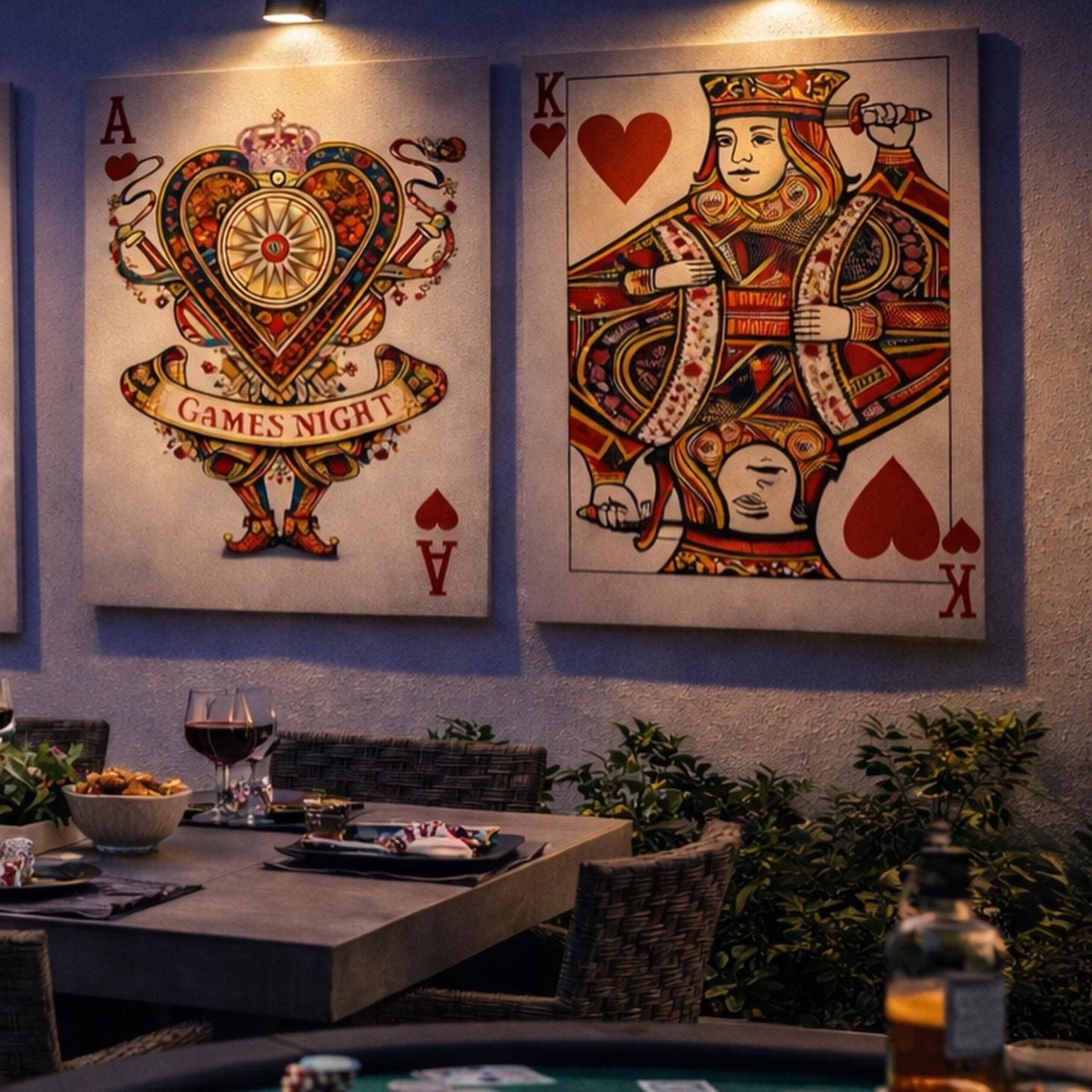 Bring the spirit of classic card games and great company into your outdoor space with “Games Night”, a bold and playful piece of statement wall art inspired by traditional playing cards.