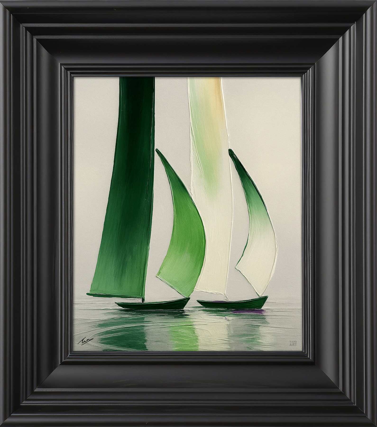 Nantucket is a serene outdoor artwork inspired by the quiet elegance and historic sailing traditions of the New England coast. Featuring softly layered green and neutral sails drifting across calm water this composition creates a peaceful nautical presence ideal for exterior spaces.