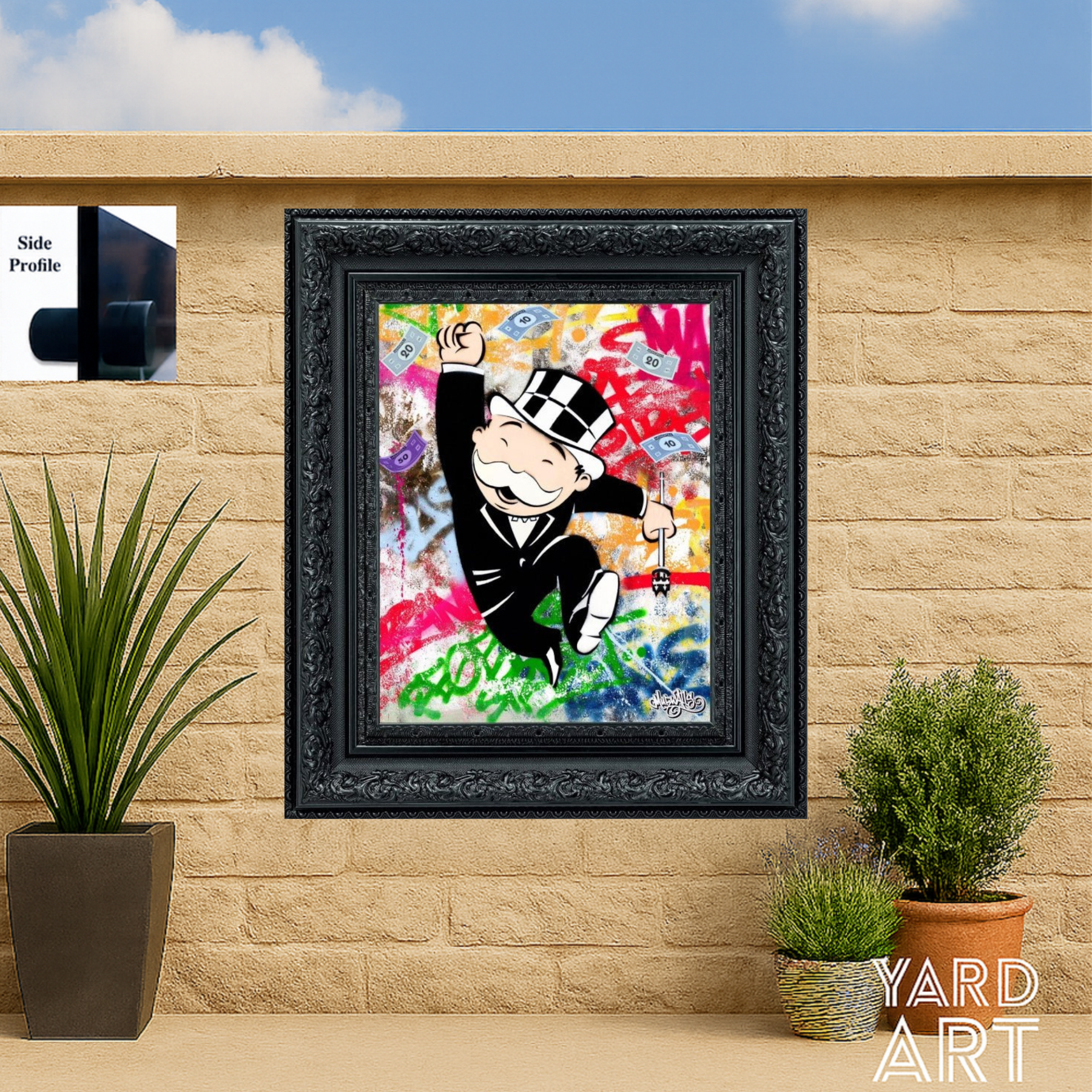 Introducing the exciting collaboration between YardArt UK and Murwalls: our newest outdoor wall art design featuring the iconic Monopoly Man by Hasbro!